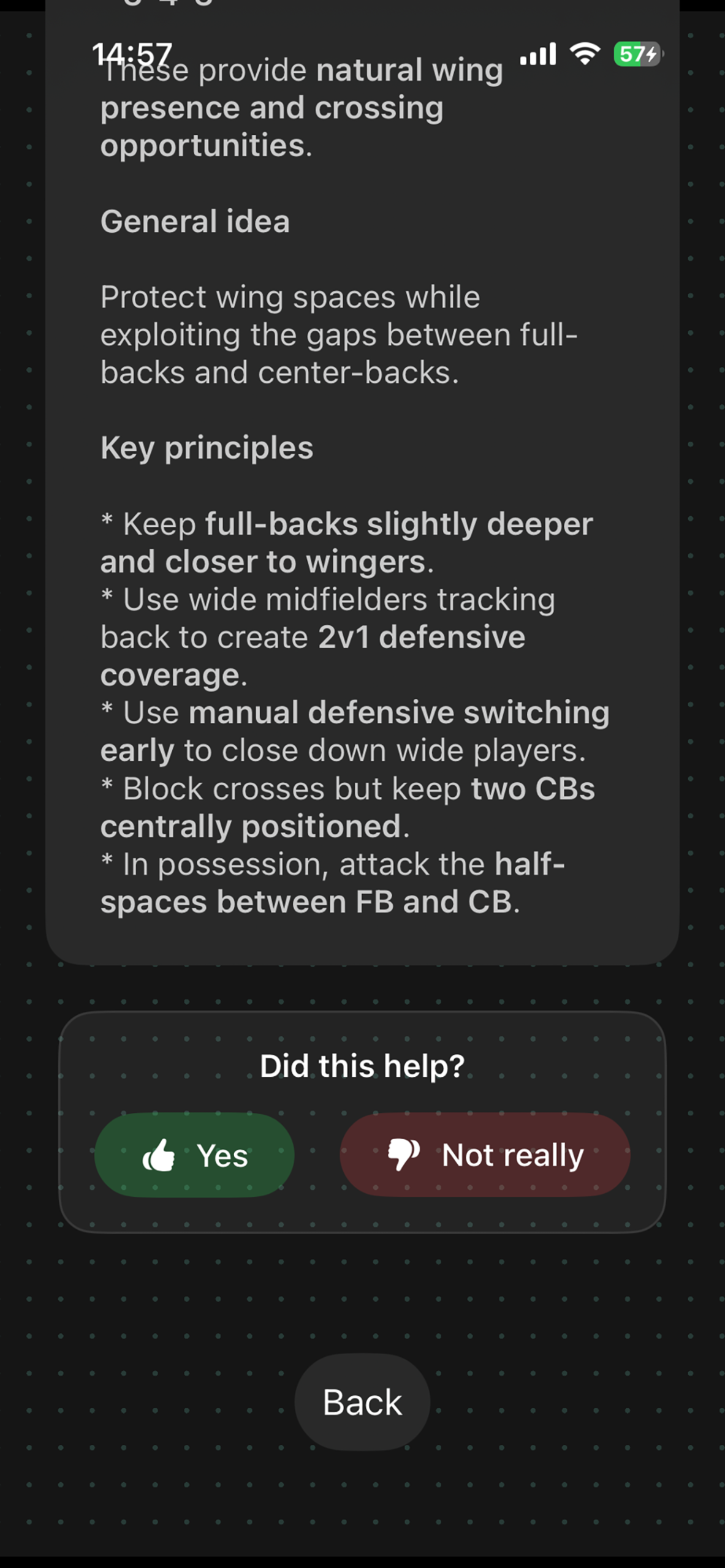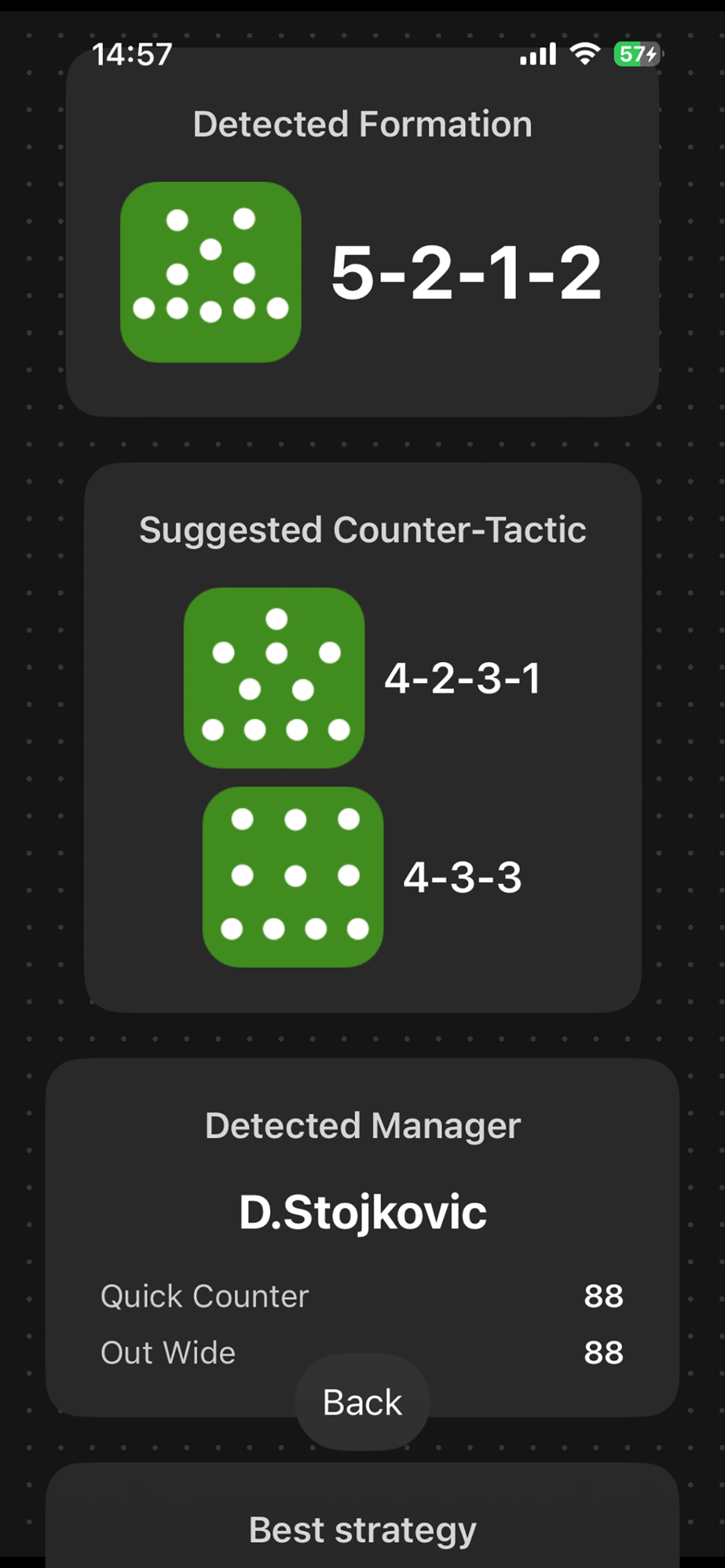 Clear tactical diagrams show detected formations and suggested counters with easy-to-understand visual representation.